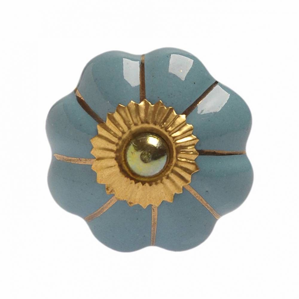 Bouton de meuble floral en céramique, de couleur bleue, avec pièces métalliques en laiton.