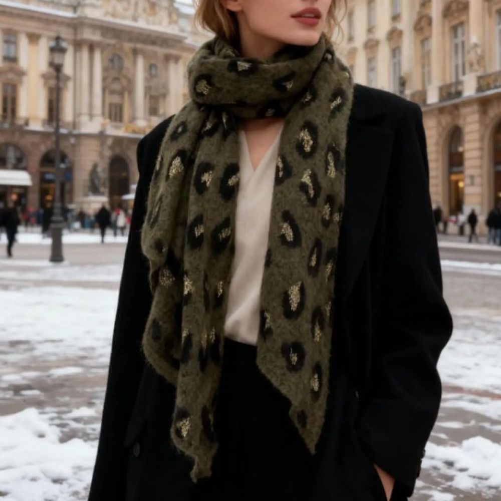 Écharpe léopard kaki longue et bien douillette, parfaite pour réhausser les tenues d’automne et d’hiver !