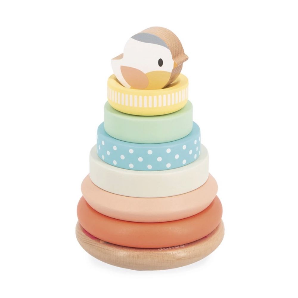 Petit oiseau retrouve son nid sur cet empilable en bois ! Adapté à bébé dès ses 12 mois, le joli volatile niche en haut de la pyramide, perché sur son socle.