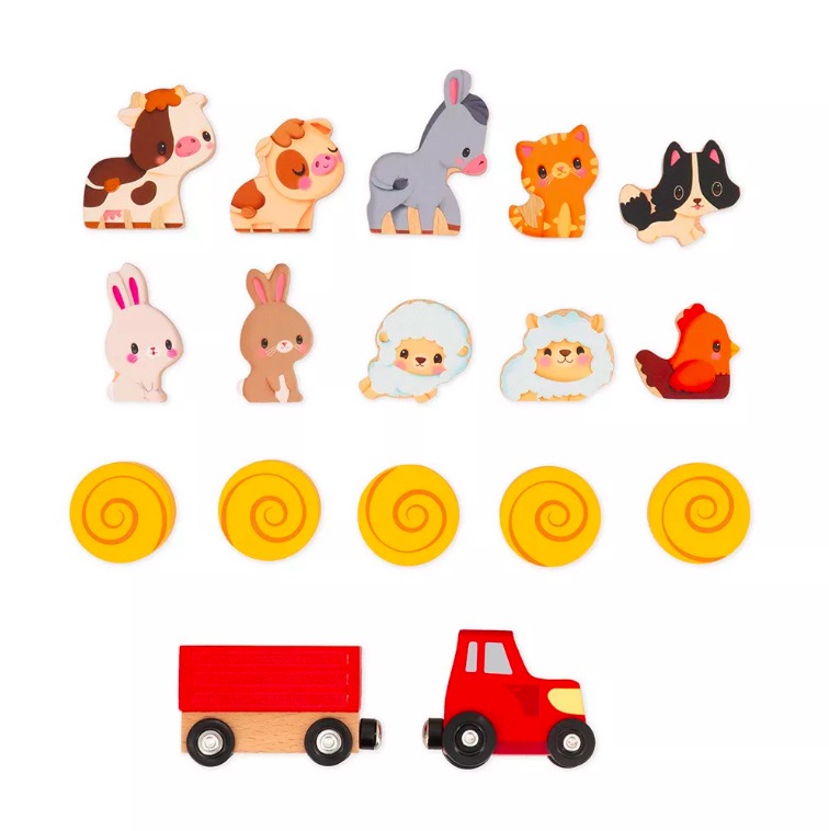 Cette ferme réaliste est livrée avec une variété d’accessoires : 17 en tout. 10 figurines animaux de la ferme (2 lapins, 2 moutons, 1 chat, 1 chien, 2 vaches, 1 âne, 1 poule), 5 ballots de paille et 1 tracteur avec sa remorque magnétique viennent compléter la maisonnette.