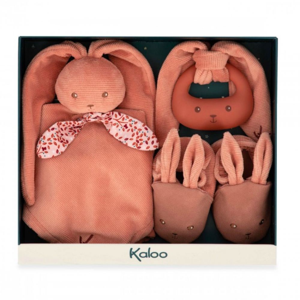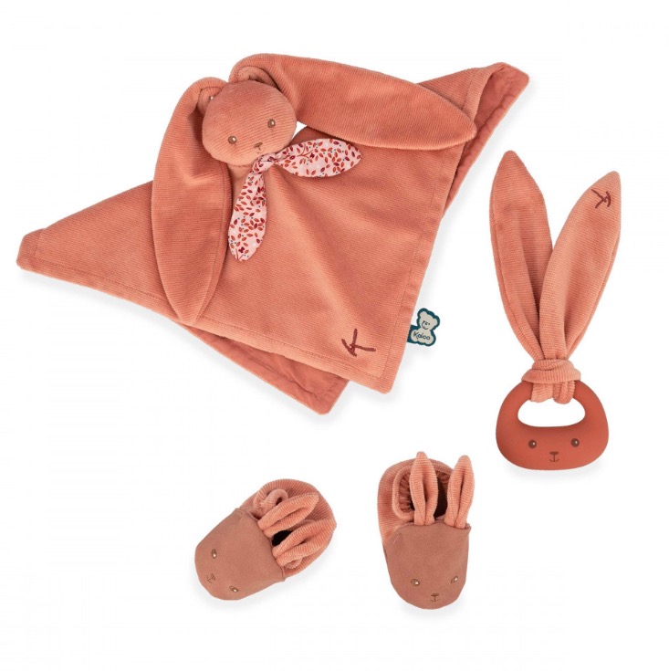 Offrez ce superbe coffret cadeau de naissance contenant 3 indispensables spécialement conçus pour bébé. Ce coffret comprend un doudou lapin, un anneau de dentition en silicone et de charmants chaussons lapin, tous dans une magnifique teinte terracotta.