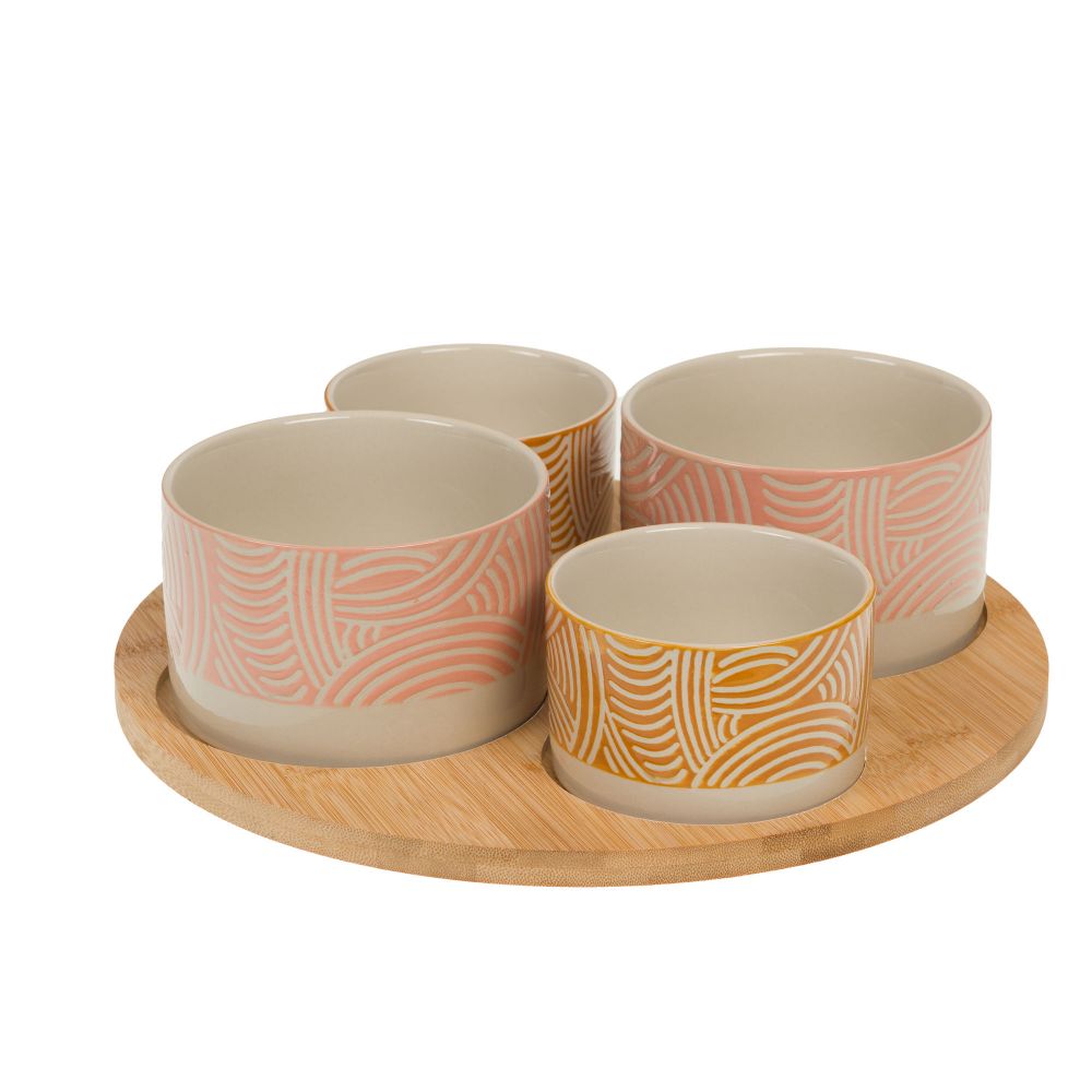 Apportez une touche de convivialité et de couleur à vos apéritifs avec ce set composé d’un plat en bois et de quatre bols en grès décorés de motifs modernes. Parfait pour partager des petites gourmandises entre amis, il combine élégance et praticité pour sublimer vos moments de partage.